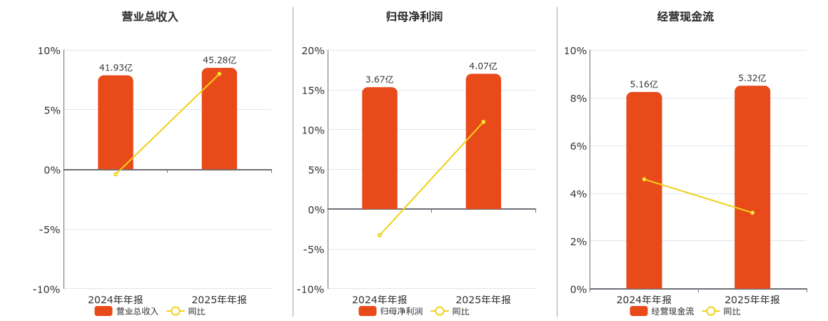 公司营业总收入为45.28亿元。归母净利润为4.07亿元。经营活动现金净流入为5.32亿元。