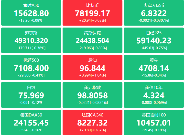 期货:现货黄金跌1.04%报4690.57美元;黄金期货跌0.98%报4706.50美元;现货白银跌2.91%报75.4434美元;白银期货跌3.24%报75.985美元;铜期货跌1.66%报6.;0865美元,现货铂金跌3.36%,现货钯金跌4.89%;原油期货报95.85美元,布伦特原油报105.07美元;中东原油期货涨1.13%报104.29美元;天然气期货报2.6140美元,汽油期货报3.4621美元;NYMEX 5月取暖油期货收报3.9882美元/加仑。