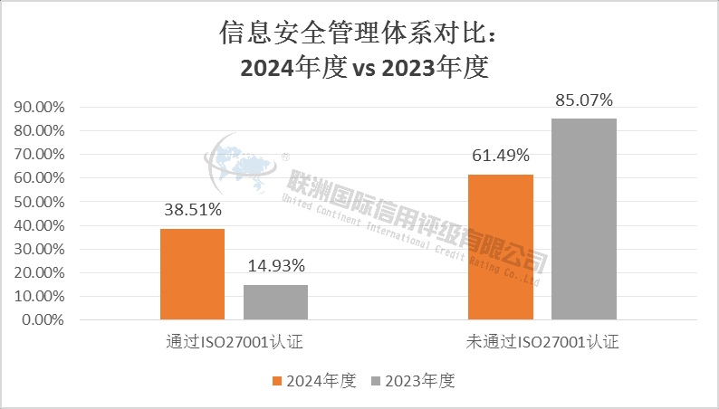 在信息安全管理体系方面,2024年度有38.51%的公司通过ISO27001认证,而在2023年度则有14.93%的公司通过ISO27001认证,占比上升了23.53%。整体上,制药、生物科技和生命科学行业上市公司在信息安全管理体系建设方面实现了大幅提升,行业对信息安全的重视程度与标准化建设推进力度显著增强。