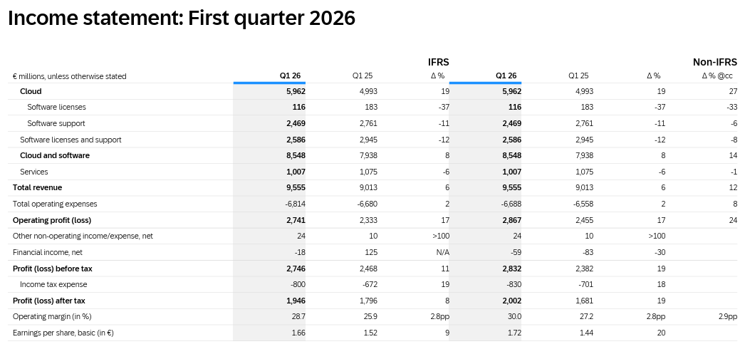 TradingKey - SAP SE公布2026年第一季度财报。期内,在国际财务报告准则下,集团总收入95.55亿元,同比增长6%,与市场预期基本吻合。归属于母公司净利润19.32亿元(欧元,下同),同比增长9%;摊销后每股净利为1.65元,去年同期为1.51元,同比增长9%。