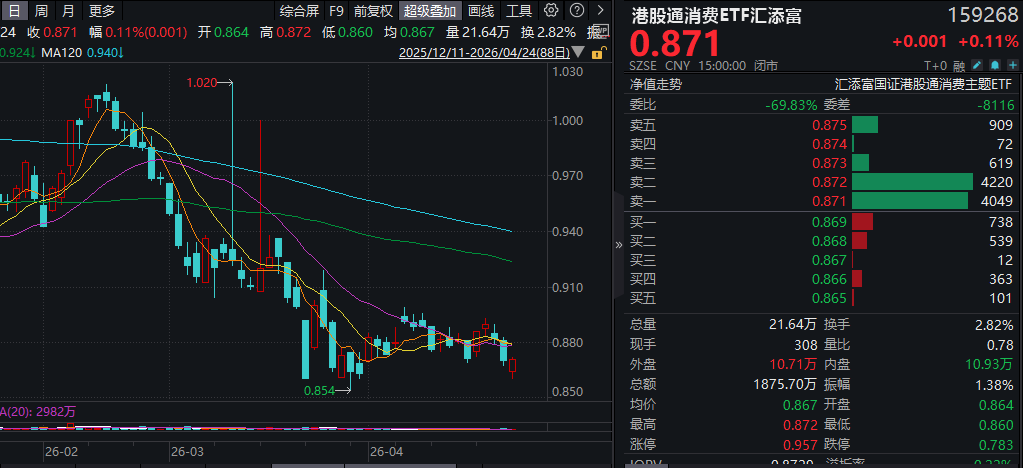港股消费方面,聚焦纯正新消费的港股通消费ETF汇添富(159268)小幅收涨0.11%,全天成交额超1800万元。截至15:03,热门成分股涨跌互现,蒙牛乳业涨超2%,巨子生物、泡泡玛特、李宁涨超1%(成分股仅做展示,不作为个股推介)。