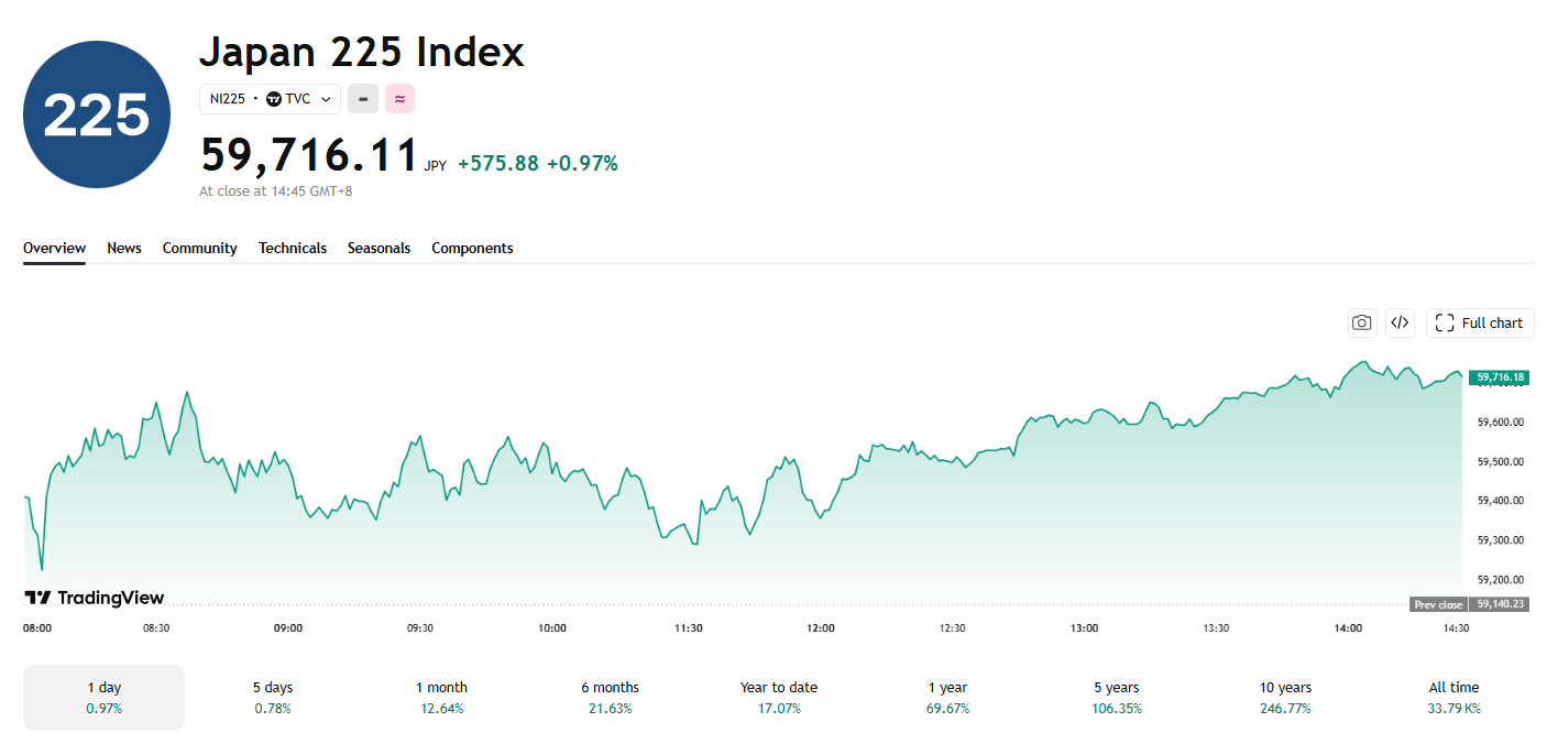 日经225指数早盘高开高走,午后涨幅逐步扩大,全日收涨0.97%,报59716.11点。盘中高见59763.68点,低见59225.37点。