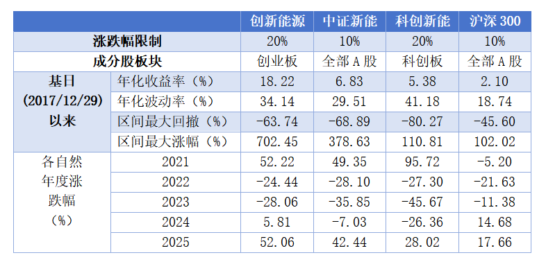 回溯2020-2021年新能源上行周期,创业板新能源指数的区间涨幅显著高于中证新能源指数。其背后的逻辑在于:创业板成分股的市值中枢更低、机构持仓占比相对较低,且创业板股票涨跌幅波动空间,进一步放大了指数在趋势行情中的弹性表现。对于指数化工具而言,“低估值 高弹性”的组合,在资产配置中天然具备较高的赔率价值。
