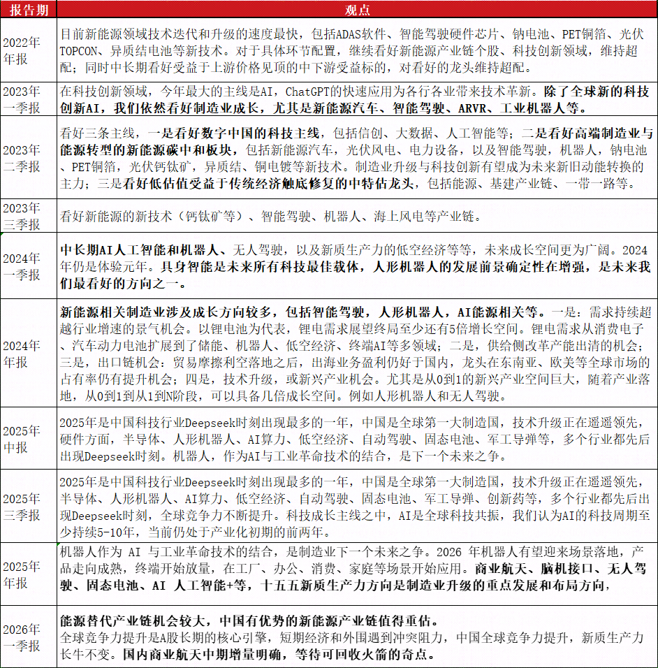 十六年前,闫思倩以电新行业卖方研究员身份入行,十余年间见证了新能源行业的崛起,也积淀了深厚的制造产业投资经验和心得。从新能源到人工智能,再到2026年1季报披露的商业航天持仓,她始终将自身能力圈与时代产业趋势进行耦合,置身于科技产业的最前沿。这一特点在她管理基金的定期报告中清晰可见: