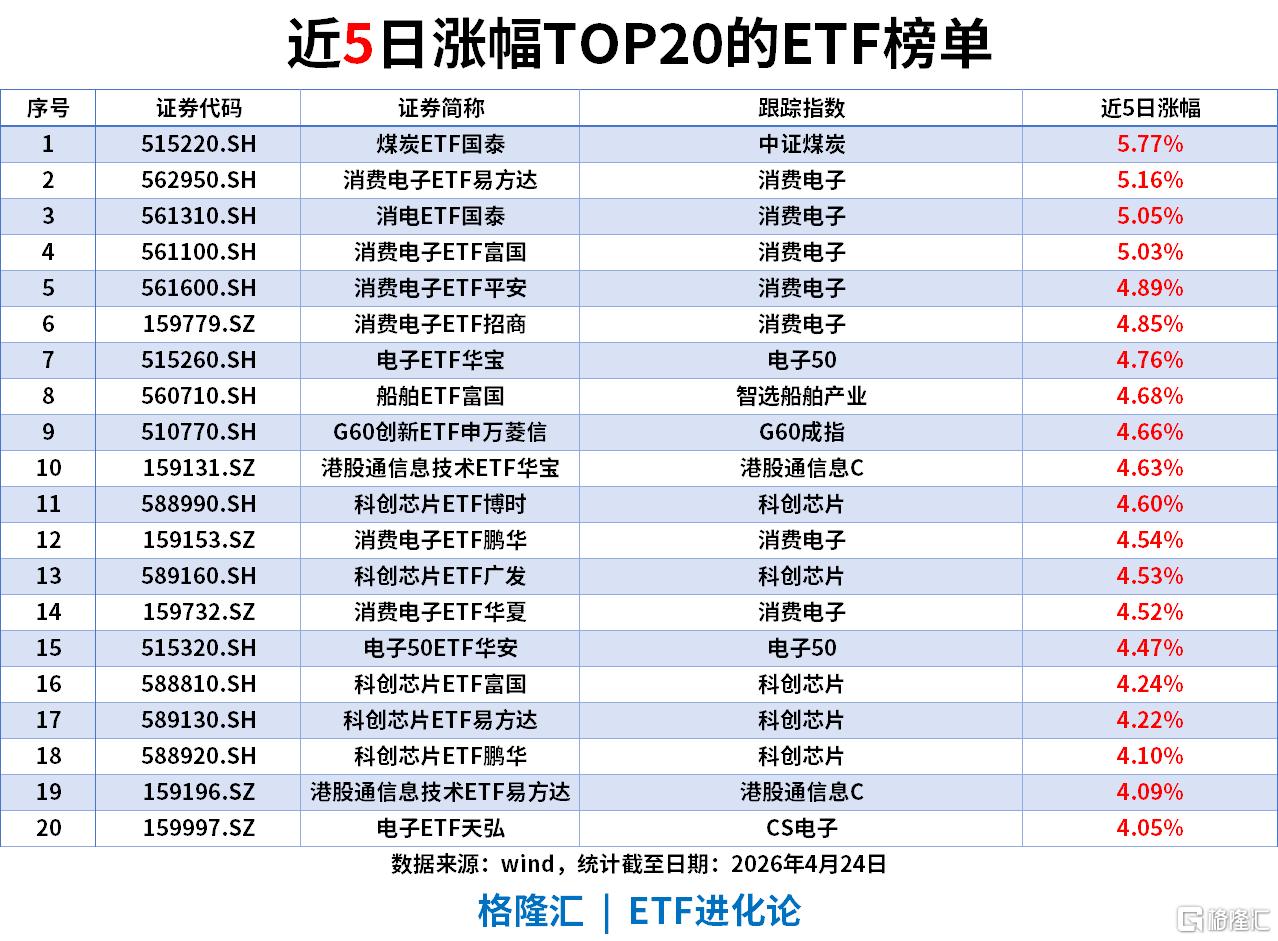 消费电子板块强势领跑,煤炭、科创芯片赛道同步发力,成长风格占据主导。消费电子ETF易方达、国泰、富国等品种包揽榜单前6席,消费电子ETF易方达以5.16%领涨。