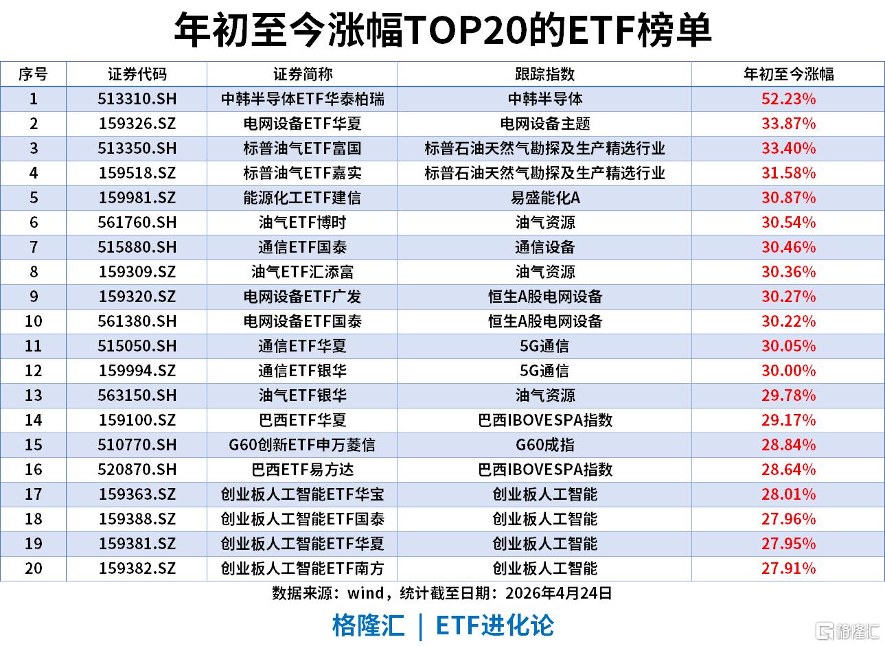 年度主线格局清晰稳固,中韩半导体ETF华泰柏瑞以52.23%的涨幅登顶年度最强ETF,成为成长赛道绝对龙头。电网设备ETF华夏以33.87%位列第二,标普油气ETF富国、标普油气ETF嘉实涨幅均超31%。