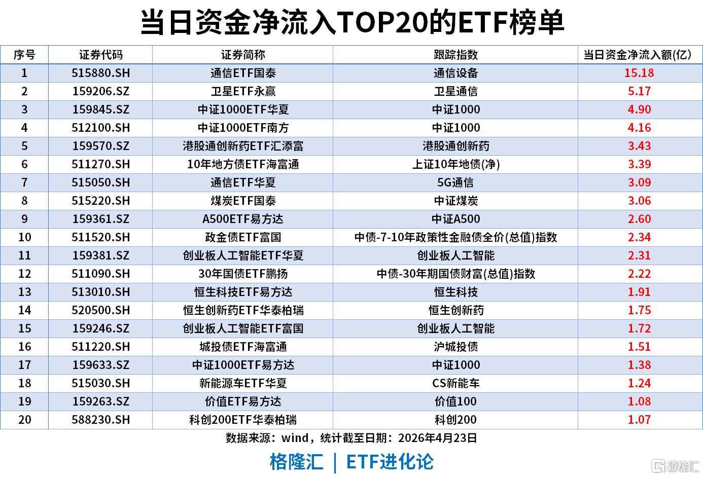 当日资金高度聚焦通信赛道,通信设备ETF国泰以15.18亿净流入领跑,、通信ETF华夏同步录得3.09亿流入,通信板块成为绝对主线。卫星ETF永赢净流入5.17亿。