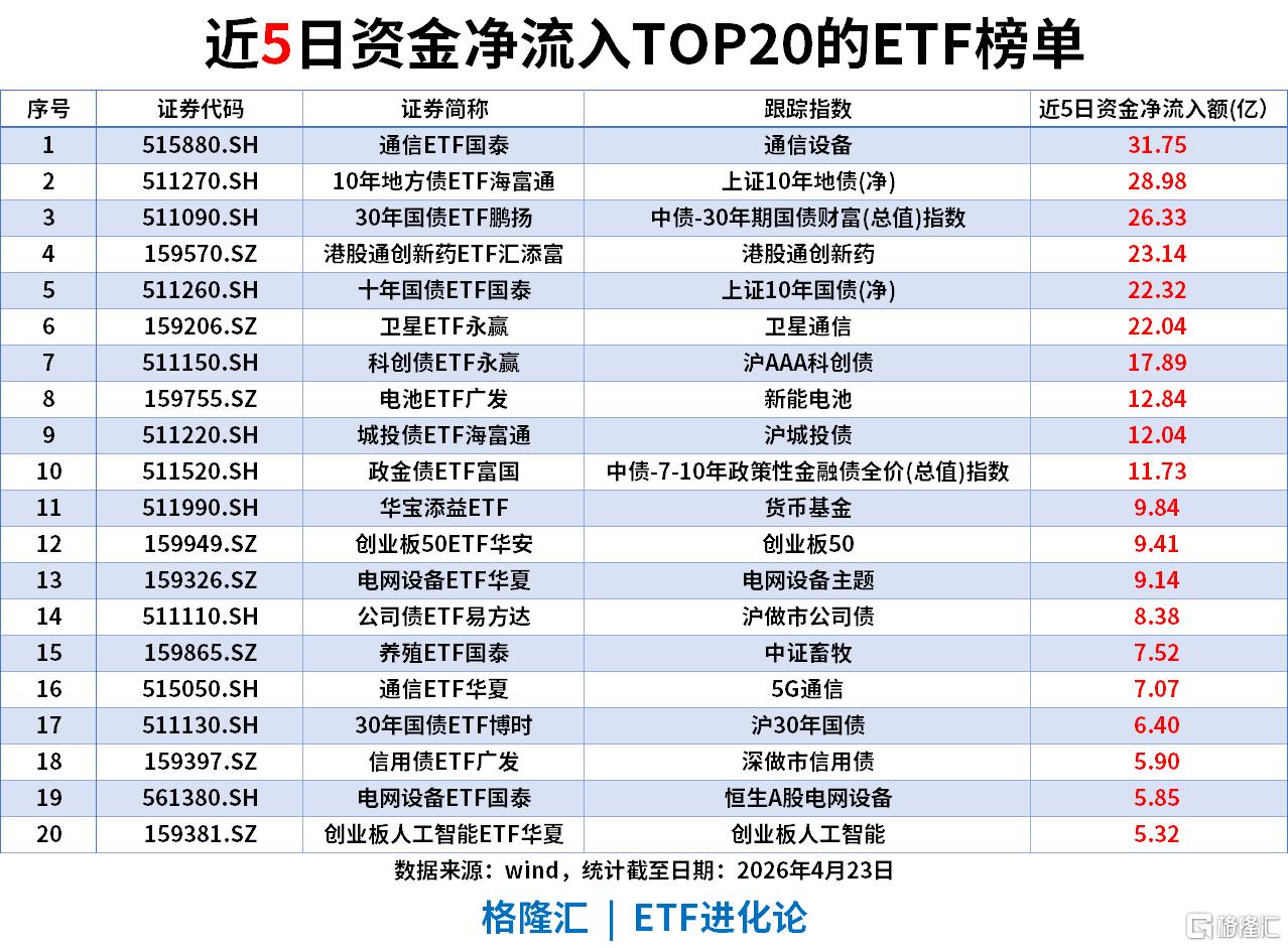 中期资金通信与固收双主线驱动,通信板块强势领涨,债类资产同步获配置。通信ETF国泰以31.75亿净流入大幅领跑,通信ETF华夏同步录得7.07亿流入】。10年地方债ETF海富通、30年国债ETF鹏扬等债类品种合计流入超55亿,为市场提供稳定底仓。