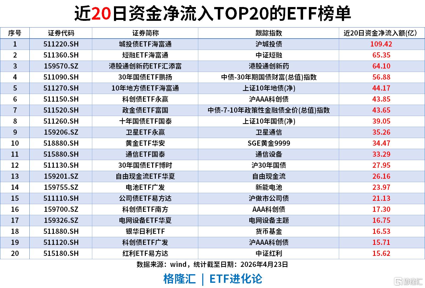 中长期资金形成固收防御、医药与科技成长均衡配置的清晰格局。城投债ETF海富通以109.42亿净流入登顶,港股通创新药ETF汇添富以64.10亿净流入位列第三,成为成长赛道中资金流入最高的品种;卫星ETF永赢、通信ETF国泰、黄金ETF华安均净流入超30亿。