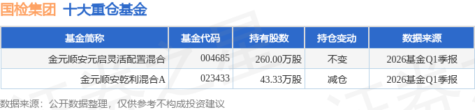 持有国检集团最多的基金为金元顺安元启灵活配置混合,目前规模为15.76亿元,最新净值6.8014(4月23日),较上一交易日下跌0.51%,近一年上涨37.3%。该基金现任基金经理为缪玮彬。