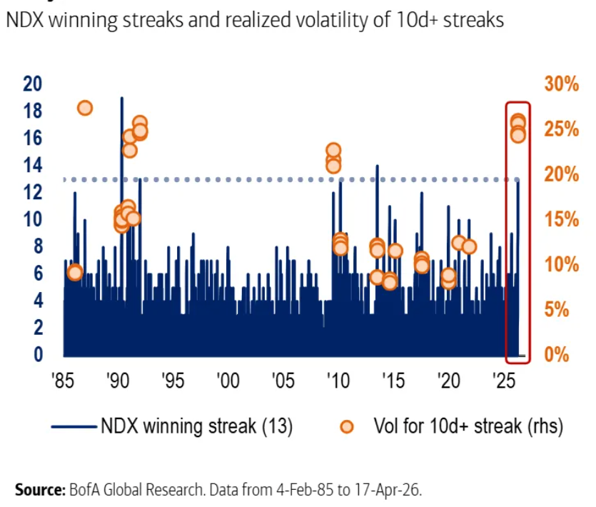 该行策略师指出,纳斯达克100指数正重现类似互联网泡沫时期的走势。截至周三的16个交易日中,该指数有14个交易日与10日实际波动率同步走高。这完全违背历史常态:股市上涨阶段,行情波动通常会逐步收窄。