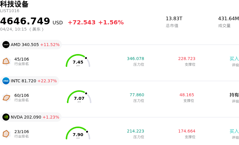 科磊 (KLAC) 盘中上涨3.77%, 所属行业科技设备上涨1.56% ,公司涨幅跑赢行业涨幅,行业成交额前三股票 超威半导体 (AMD) 上涨 11.52%;英特尔 (INTC) 上涨 22.37%;英伟达 (NVDA) 上涨 1.23%。