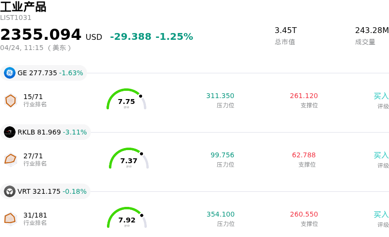 雷神技术 (RTX) 盘中下跌3.27%, 所属行业工业产品下跌1.25% ,公司涨幅跑输行业涨幅,行业成交额前三股票 GE航天航空 (GE) 下跌 1.63%;Rocket Lab USA Inc (RKLB) 下跌 3.11%;Vertiv Holdings Co (VRT) 下跌 0.18%。