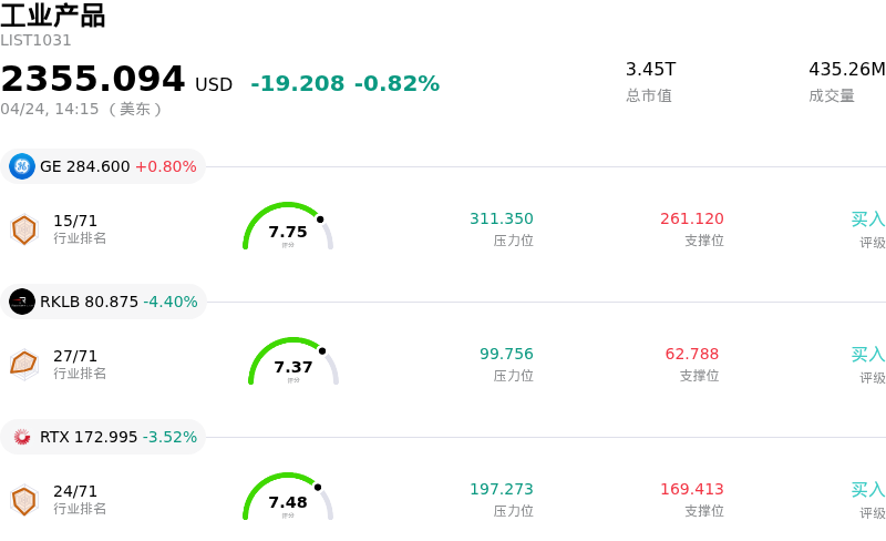 洛克希德马丁 (LMT) 盘中下跌3.89%, 所属行业工业产品下跌0.82% ,公司涨幅跑输行业涨幅,行业成交额前三股票 GE航天航空 (GE) 上涨 0.80%;Rocket Lab USA Inc (RKLB) 下跌 4.40%;雷神技术 (RTX) 下跌 3.52%。