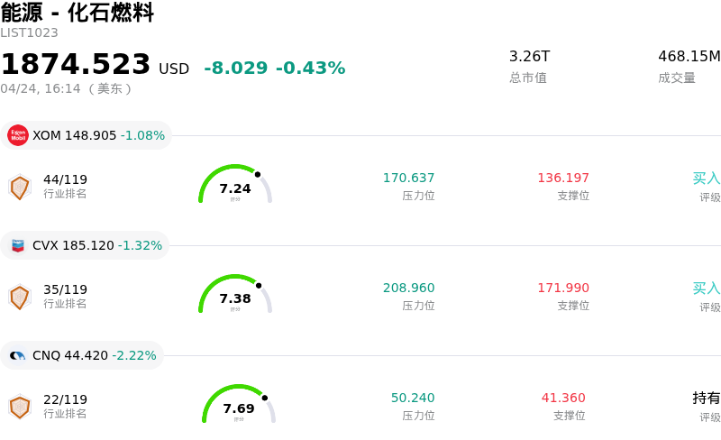 Baker Hughes Co (BKR) 收盘上涨6.95%, 所属行业能源 - 化石燃料下跌0.43% ,公司涨幅跑赢行业涨幅,行业成交额前三股票 埃克森美孚 (XOM) 下跌 1.08%;雪佛龙 (CVX) 下跌 1.32%;Canadian Natural Resources Ltd (CNQ) 下跌 2.22%。