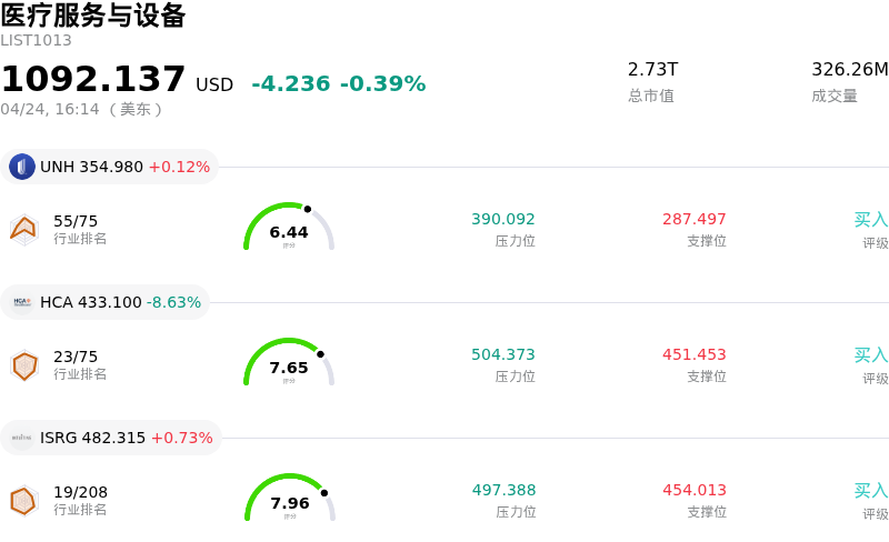 波士顿科学 (BSX) 收盘下跌5.56%, 所属行业医疗服务与设备下跌0.39% ,公司涨幅跑输行业涨幅,行业成交额前三股票 联合健康 (UNH) 上涨 0.12%;HCA控股 (HCA) 下跌 8.63%;直觉外科 (ISRG) 上涨 0.73%。