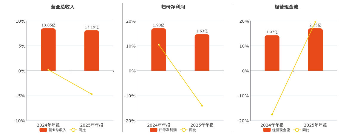 公司营业总收入为13.19亿元,在已披露的同业公司中排名第37,较去年同报告期营业总收入减少6519.80万元,同比较去年同期下降4.71%。归母净利润为1.63亿元,在已披露的同业公司中排名第25,较去年同报告期归母净利润减少2667.44万元,同比较去年同期下降14.05%。经营活动现金净流入为2.35亿元,在已披露的同业公司中排名第19,较去年同报告期经营活动现金净流入增加3854.85万元,同比较去年同期上涨19.57%。