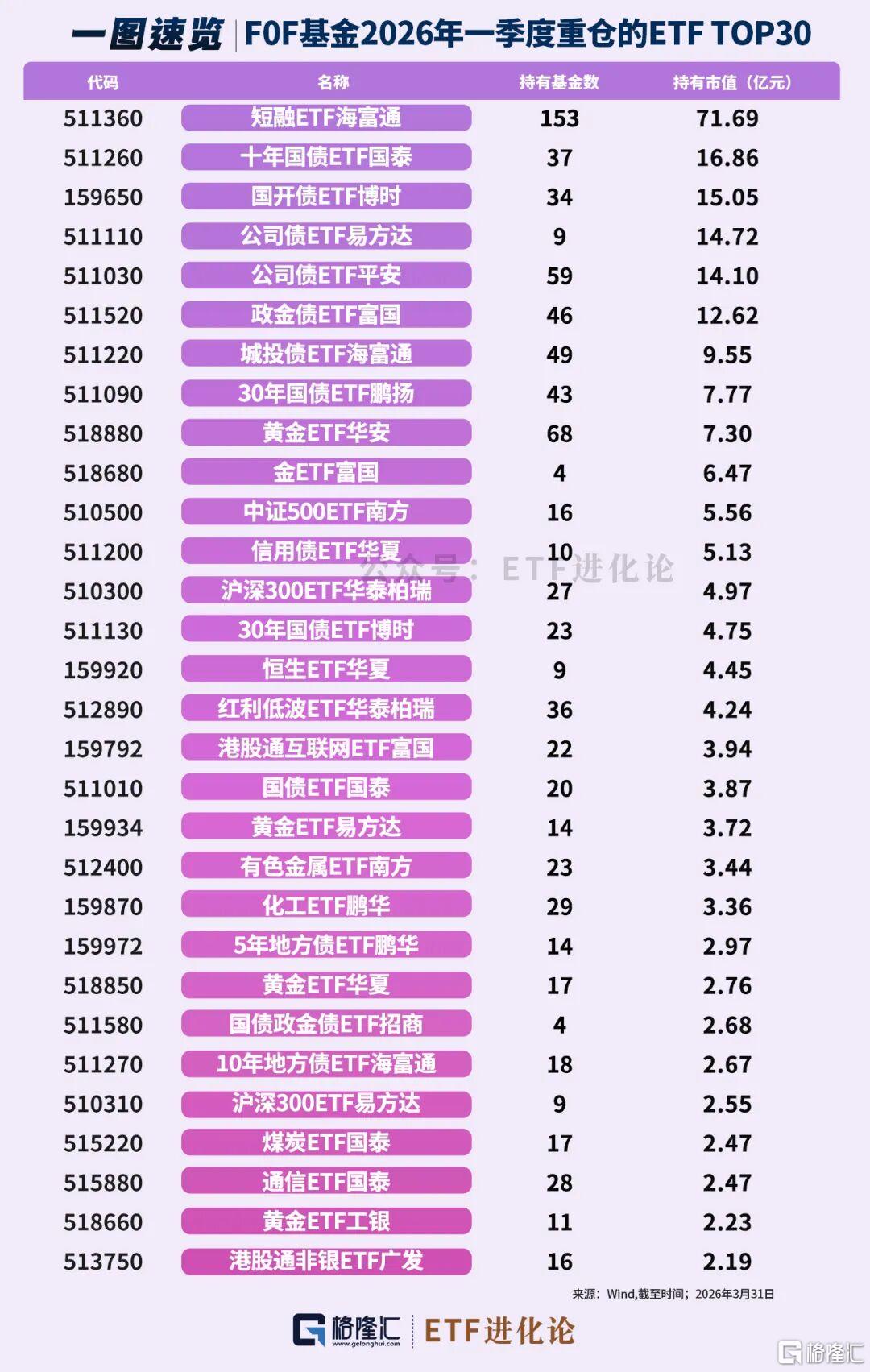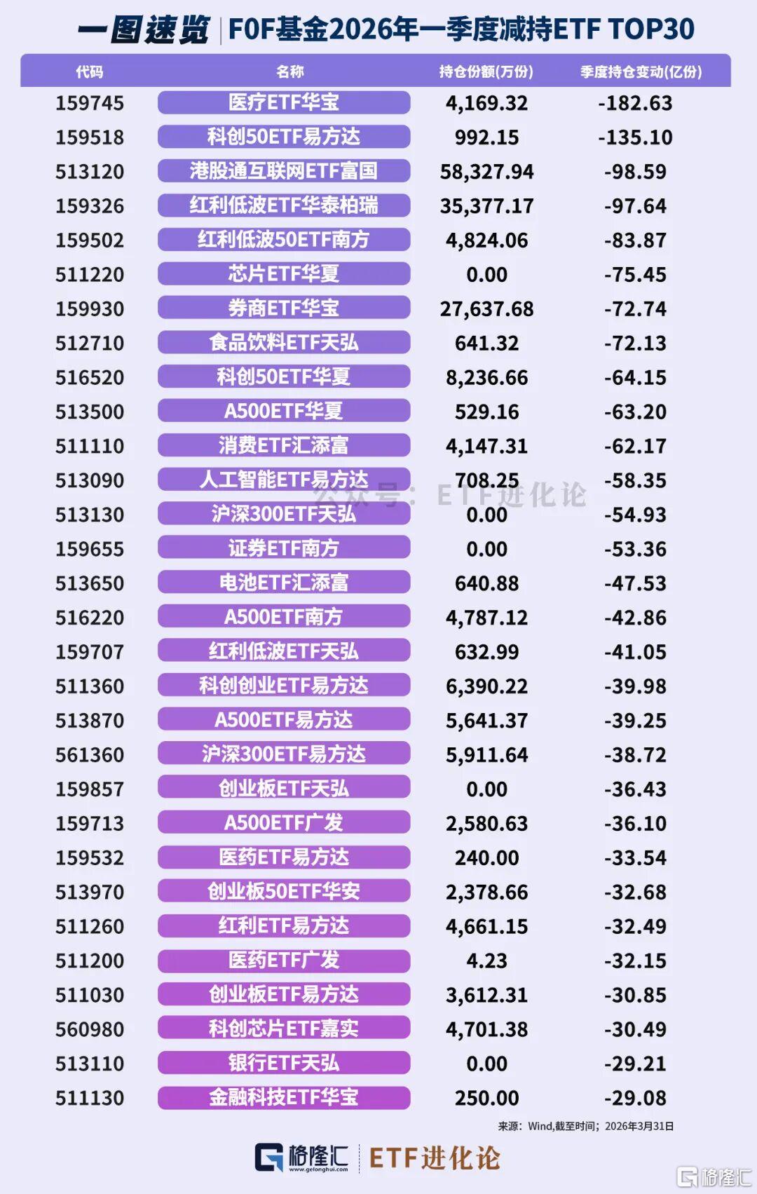 FOF一季度减持最多的ETF是:医疗ETF华宝、科创50ETF易方达、港股通互联网ETF富国和红利低波ETF华泰柏瑞。