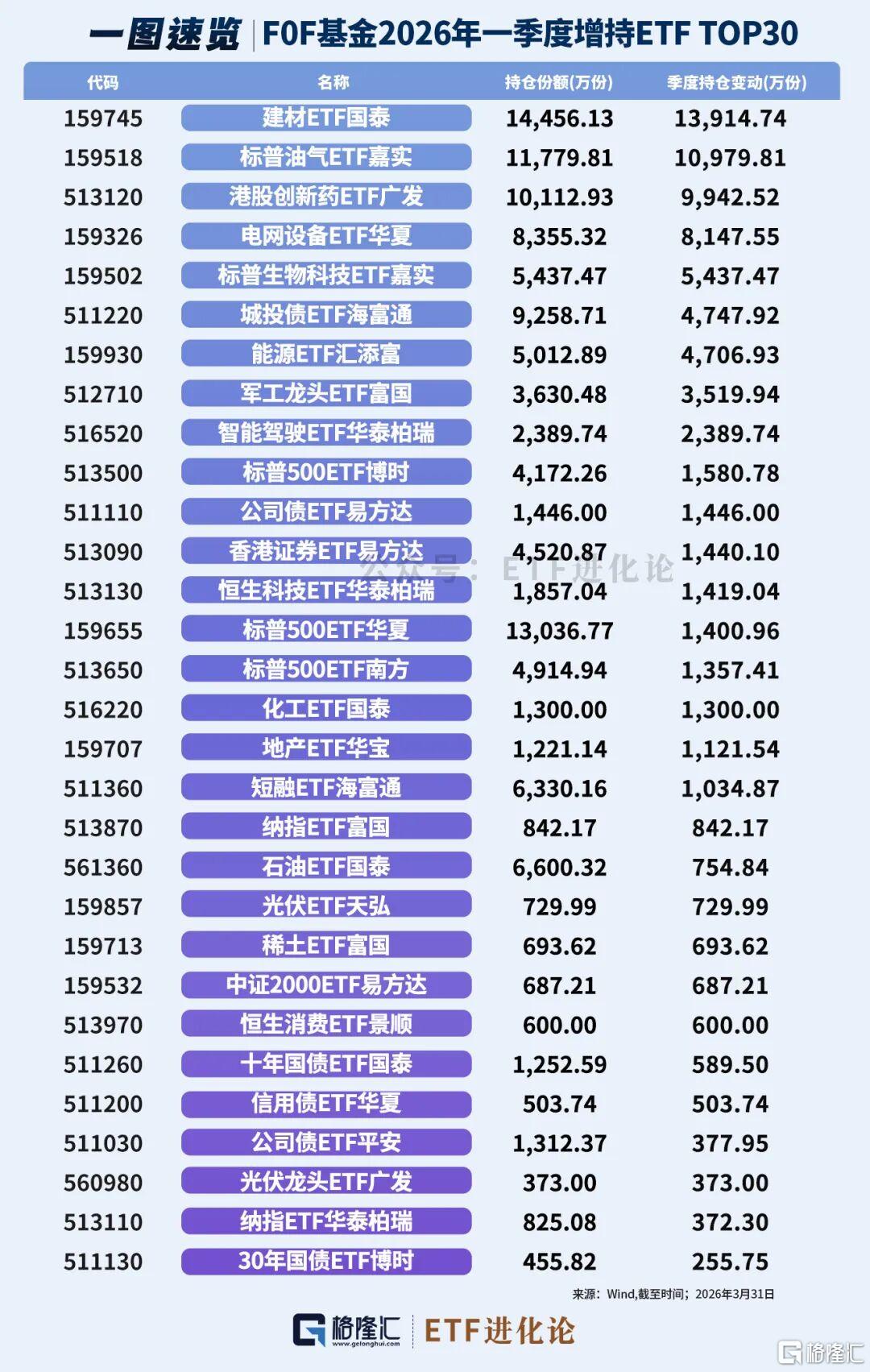 从变化来看,FOF一季度增持最多的ETF是建材ETF国泰、标普油气ETF嘉实、港股创新药ETF广发和电网设备ETF华夏等。