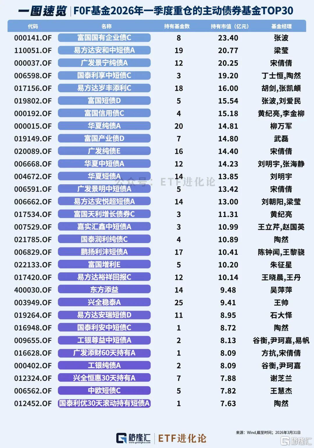 一季度FOF重仓的债券型基金有:富国国有企业债C、易方达安和中短债A和广发景宁纯债A,持有规模均超20亿元。