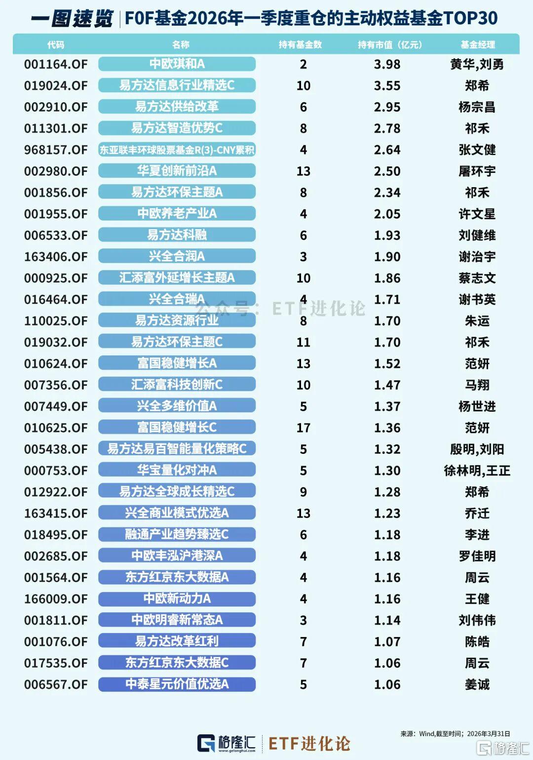 一季度FOF重仓规模靠前的主动权益基金有:中欧琪和A、易方达信息行业精选C和易方达供给改革;