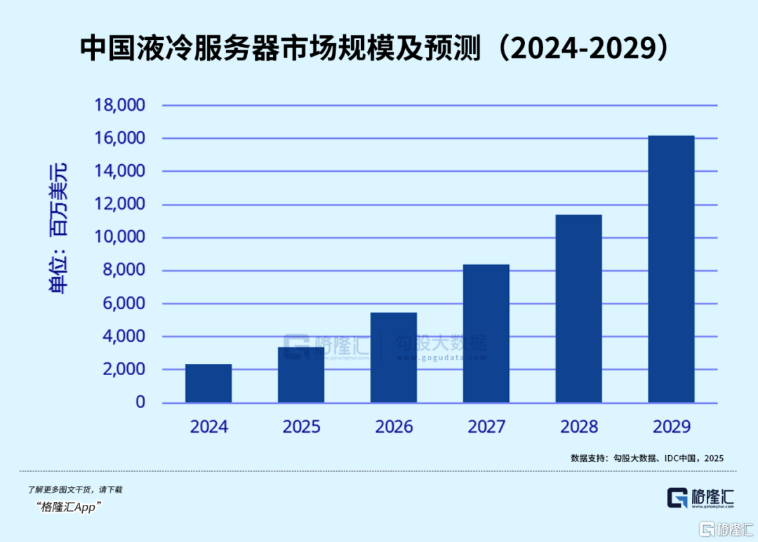 中国市场增速更快——根据IDC数据,2029年中国液冷服务器市场规模162亿美元,年复合增速46.8%。