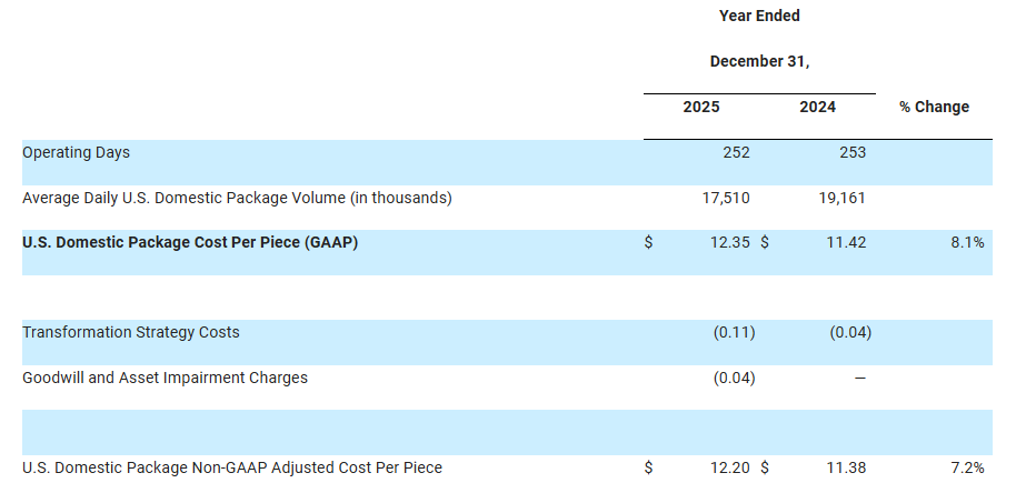 回顾去年的财报,联合包裹2025年第四季合并营收为245亿美元,略高于预期的240亿美元;经调整每股盈利2.38美元,亦胜预期。但推动业绩改善的核心驱动力在于公司转向“精益求精而非规模扩张”的战略,即致力于提升盈利能力而非单纯追求业务量增长。