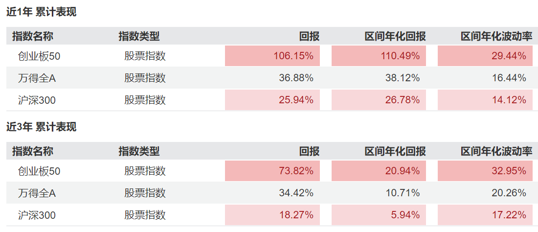 截至2026年4月24日,创业板50指数近一年涨幅达106.15%,近三年涨幅达73.82%,同期万得全A指数分别为36.88%和34.42%,沪深300指数分别为25.94%和18.27%。