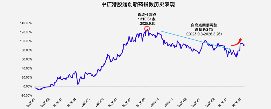 指数涨跌幅仅供参考,不预示未来表现,亦不代表具体基金表现。市场有风险,投资须谨慎。中证港股通创新药指数2021年-2025年各年度业绩分别为:-7.25%、-23.26%、-19.91%、-14.40%、72.75%