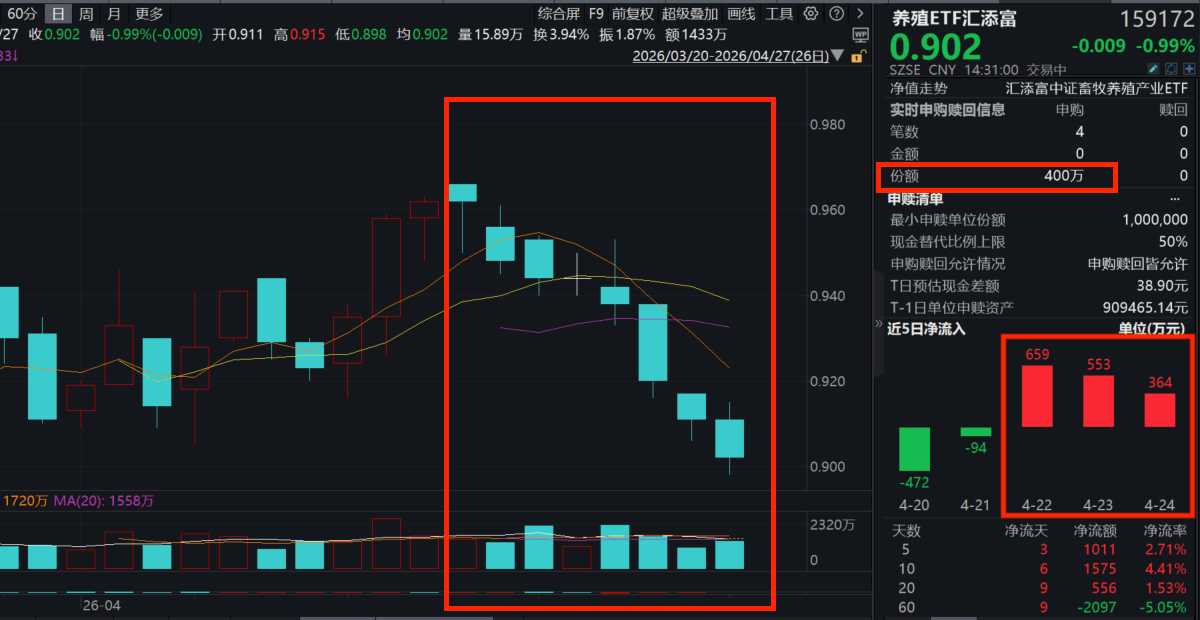 今日(4.27),A股震荡飘红,养殖板块再度回调。全市场“含猪量”更高更纯的养殖ETF汇添富(159172)跌近1%四连阴走势,盘中放量成交超1400万元,规模、流动性持续领先同类!资金面上,养殖ETF汇添富(159172)盘中再获400万份净申购,近4日累计“吸金”近2000万元!