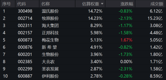 养殖ETF汇添富(159172)标的指数权重股多数飘绿:天邦食品跌超3%,牧原股份、金字火腿跌超2%,正邦食品、华统股份跌超1%,伊利股份、温氏股份微跌。上涨方面,梅花生物、三元股份逆市涨超1%。