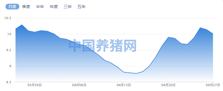 据中国养猪网,截至4月22日,生猪(外三元)10.01元/公斤(-0.13元),生猪(内三元)10.14元/公斤(-0.1元)。猪粮比4.16:1,持续低于5:1一级预警线,行业整体仍处深度亏损区间。
