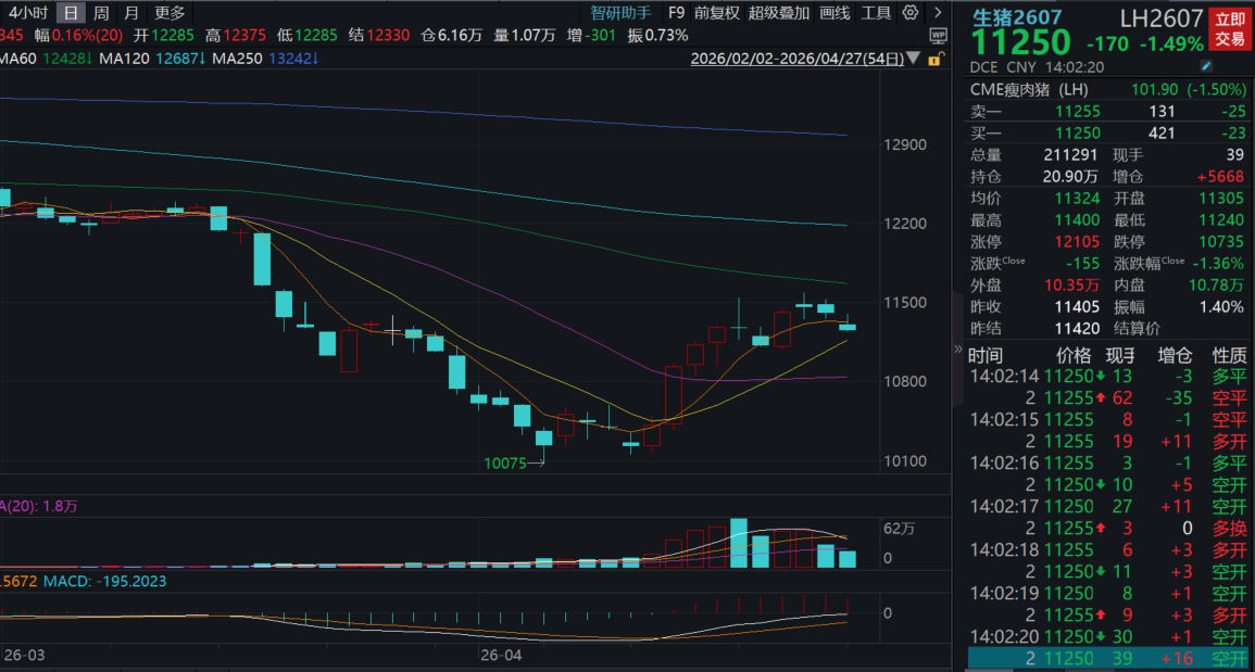 期货方面,生猪期货(主力合约LH2607)连续第二日调整。但值得关注的是,4月14日至23日,生猪2607合约出现阶段性触底反弹,价格反弹近1000元/吨