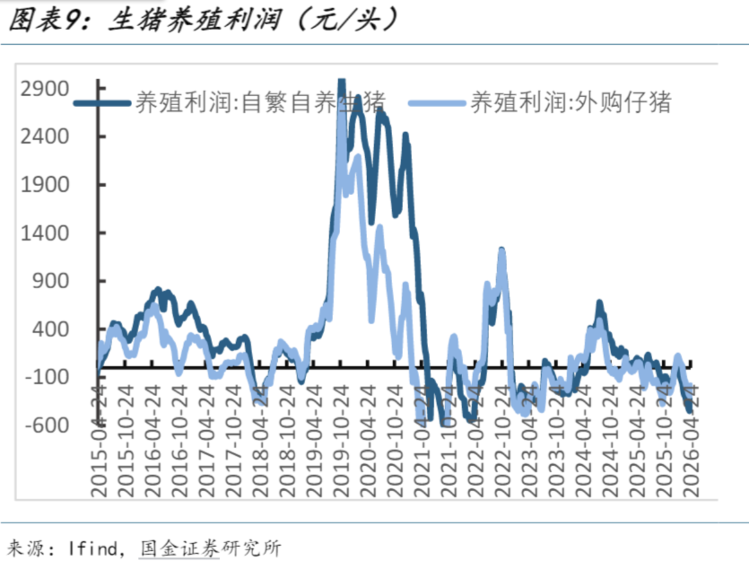 短期来看,生猪价格仍有下降空间,近期行业产能在政策调控和供给压力下已经有所减少,同时行业价格已经跌破完全成本线,预计整体亏损下行业产能去化,目前板块景气度底部企稳中长期来看,生猪养殖行业依旧有较为优秀的中枢利润,且非洲猪瘟之后行业的快速扩张中,仍有大量企业是低质量扩充产能,行业成本方差依旧巨大,头部企业有充足的超额利润释放,建议优选低成本优质企业。(国金证券20260426《生猪价格底部反弹,去产能逻辑不变》)