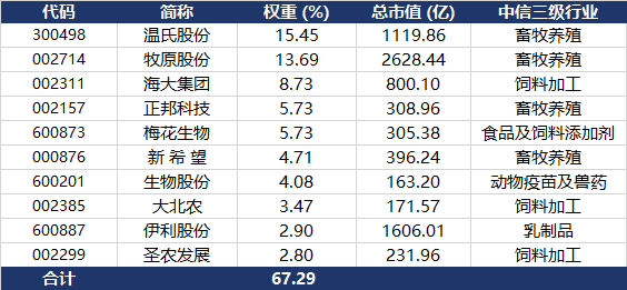 养殖ETF汇添富(159172)标的指数成分股集中度高,囊括各细分领域龙头。截至2026年3月31日,养殖ETF汇添富(159172)标的指数(中证畜牧养殖产业指数(931946))前十大权重股占比合计为67.29%,其中第一、第二大重仓股——温氏股份和牧原股份,合计占比高达29.13%,重仓A股优质“生猪龙头”;此外,指数重仓股还包括饲料加工龙头海大集团(占比8.73%)、大北农(3.47%),以及乳制品龙头伊利股份(2.90%)。