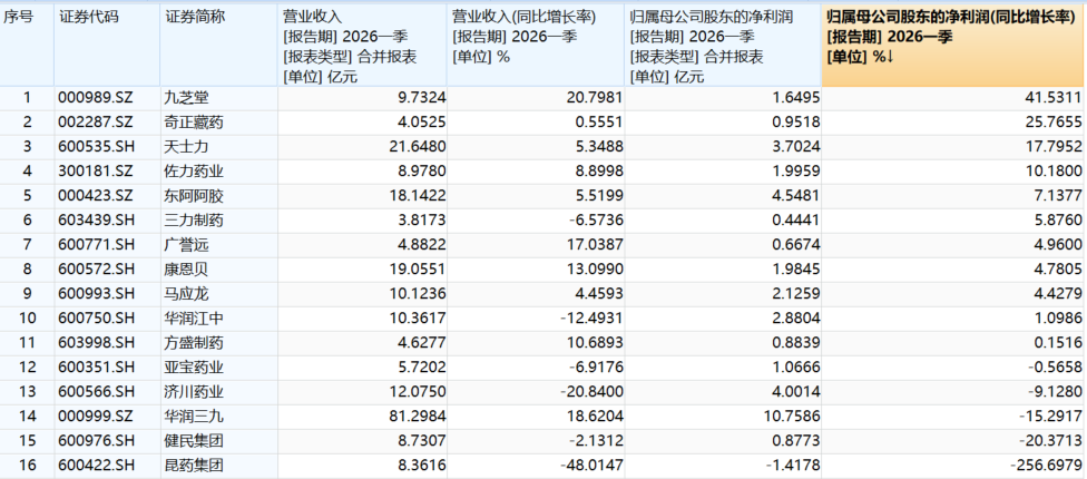 截至4月26日,中药ETF汇添富(560080)标的指数41只成分股中已有16只披露2026Q1业绩,其中15只归母净利润为正,12只归母净利润同比正增长。