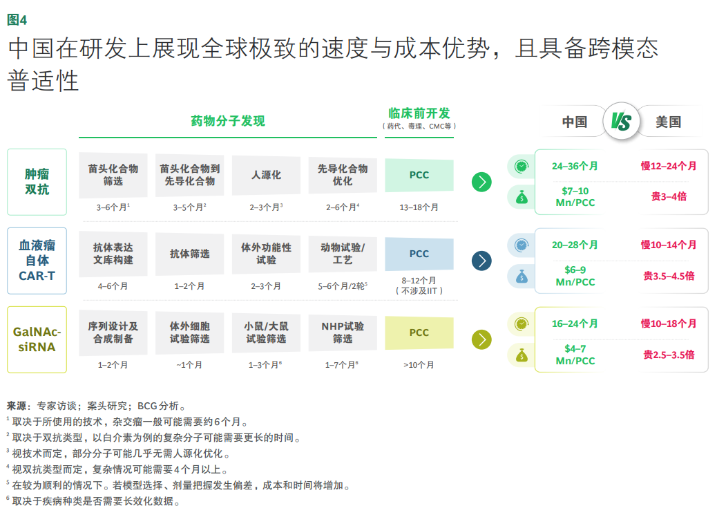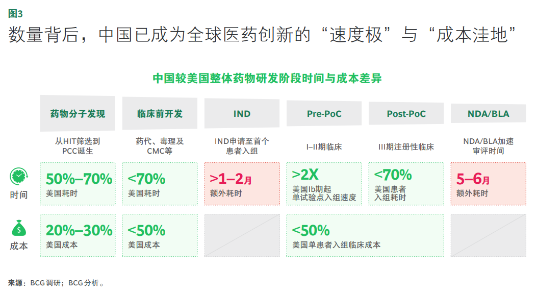 波士顿咨询(BCG)在2026年3月的深度报告《效率之后,中国医药创新的价值攀登》中指出,中国创新药之所以能形成今天的数量级,关键在于“快”与“省”两大支柱,持续支撑端到端研发链条的高效推进与规模化产出。从靶点确定到新药上市申请(NDA)及生物制品许可申请(BLA)的端到端流程,中国已成为全球医药创新的“速度极”与“成本洼地”。在药物分子发现阶段,其成本仅为美国的20%–30%,临床前开发花费也较美国节省至少一半。更为关键的是,这一优势并非局限于单一技术路线,而是具备跨模态的普适性——越是人力密集的筛选实验,越是在开发阶段涉及更多动物试验与外包协作的技术模态,中美之间在时间与成本上的差距往往越为显著。