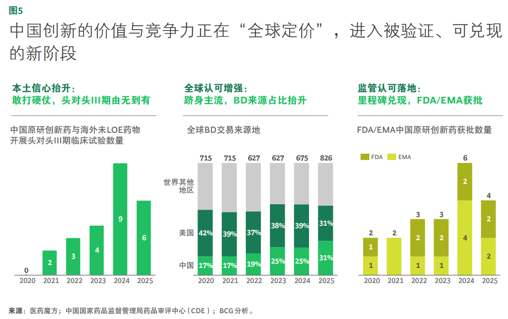 近五年,中国医药创新正在经历一轮质量飞跃。本土企业信心显著抬升,越来越多中国新药选择与多款全球重磅药物开展头对头III期临床试验。2025年新开启的研究中,也不乏对标奥希替尼、维奈克拉、阿替利珠单抗、帕博利珠单抗等国际大品种的正面对决,这背后反映出企业对自身产品与体系化研发能力的信心增强。全球认可度也在同步提升,中国资产在全球BD交易来源中的占比从2020年的17%提升至2025年的31%,与美国基本平分秋色。2025年,多笔“天价交易”集中出现,如启德与Biohaven、恒瑞与GSK、信达与武田等头部企业的交易,更直接体现出跨国企业对中国资产的态度变化。监管认可同样在持续落地,近年来中国原研创新药在FDA与EMA获批数量稳步增加,多项里程碑事件相继发生。