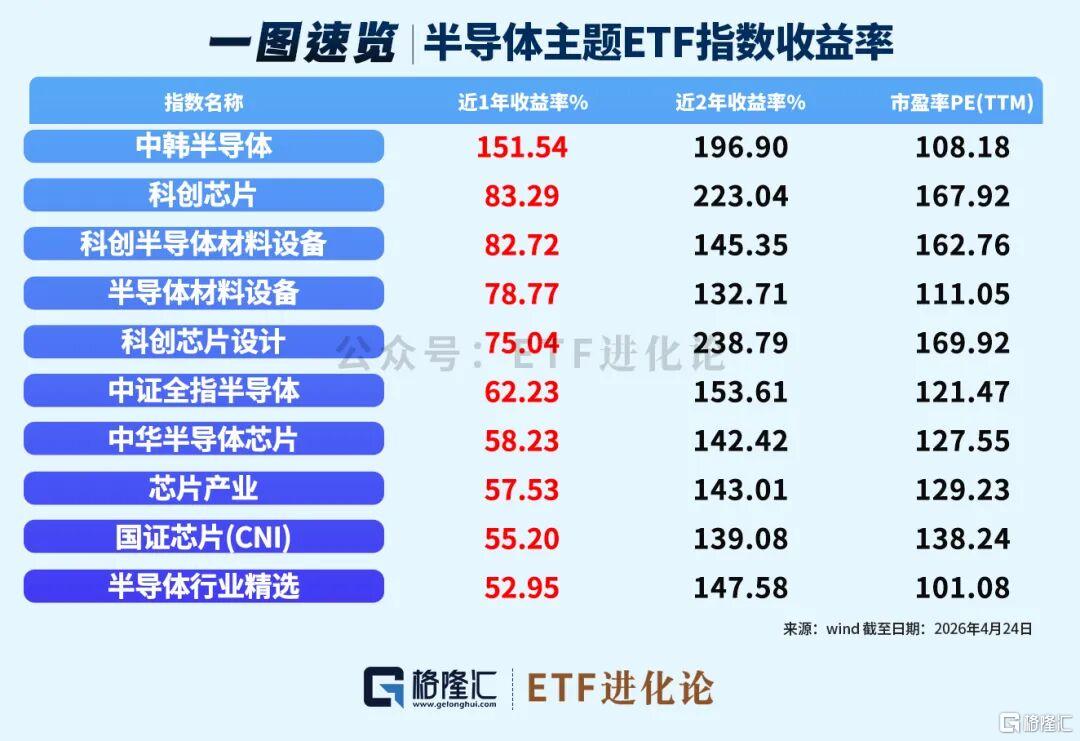 ETF方面,中韩半导体ETF标的指数近一年涨超150%,科创芯片设计ETF、科创芯片ETF等标的指数近两年涨超210%。