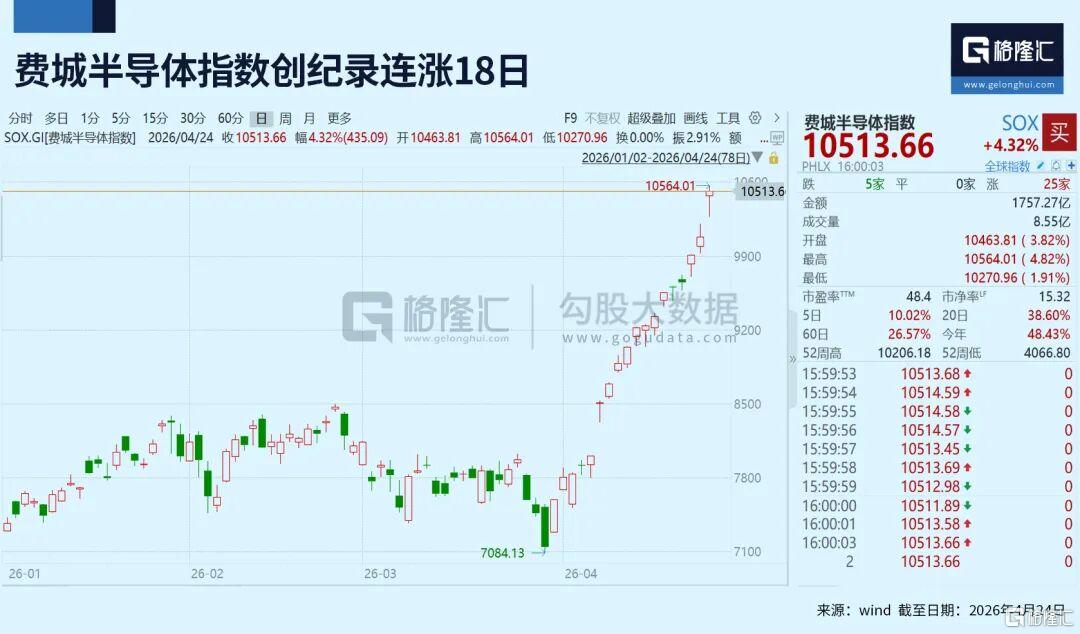 费城半导体指数的这轮上涨更是堪称史诗级。截至4月24日,SOX已连续18个交易日收涨,期间累计涨幅高达47%,创下自1994年有数据以来的最长连涨纪录。