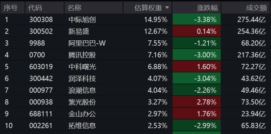 截至收盘,云计算ETF汇添富(159273)标的指数权重股涨跌不一:紫光股份涨超2%。中科曙光、金山办公涨超1%;回调方面,中际旭创、腾讯控股、润泽科技跌超3%,浪潮信息、拓维信息跌超2%,阿里巴巴-W跌超1%。