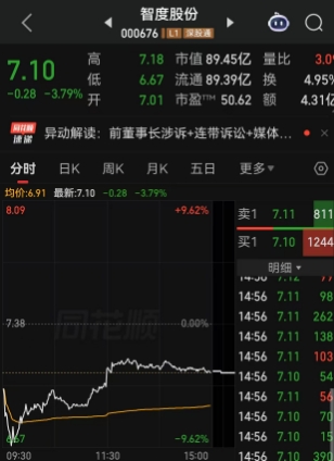 而智度股份低开近5%后,股价不断下挫,盘中一度跌超9%,不过智度股份随后开始拉升,截至收盘,报7.10元/股,下跌3.79%,收出一条大阳线。