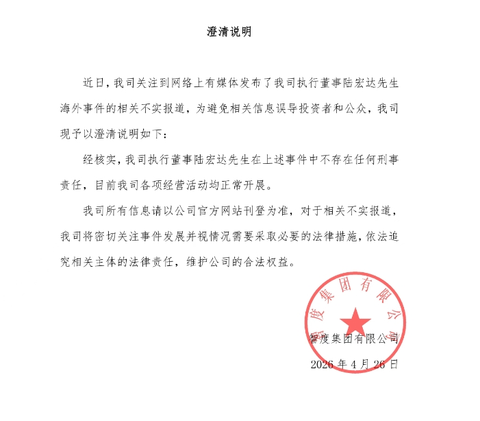 对此,智度集团4月26日发布《澄清说明》称,经核实,公司执行董事陆宏达在上述事件中不存在任何刑事责任,目前公司各项经营活动均正常开展。
