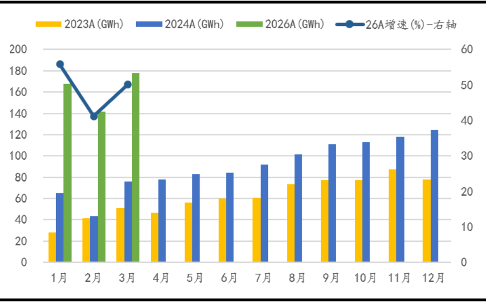 数据趋势:从趋势上看,2026年国内动力、储能电池的产量整体增速明显