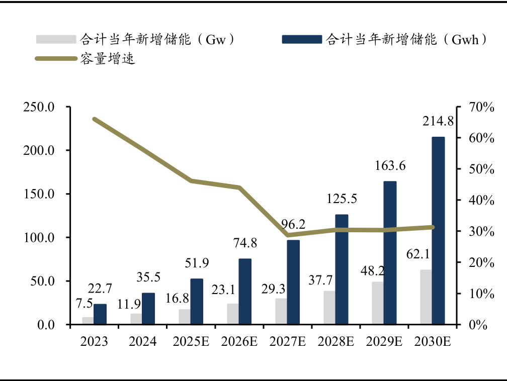 EESA数据显示欧洲年度储能新增装机将从2025的约17GW 攀升至2030E 的 64GW,新增储能规模同步由 35.7GWh 跃升至2003.6GWh,体现出需求在中期持续加速扩张。尽管容量增速在2024 年短暂回落,但在大型项目集中开工、电网灵活性需求提升及各国激励政策推动下,2025 年起增速重新抬升并保持强劲,反映出欧洲储能市场已从试点阶段全面转向规模化商业落地。
