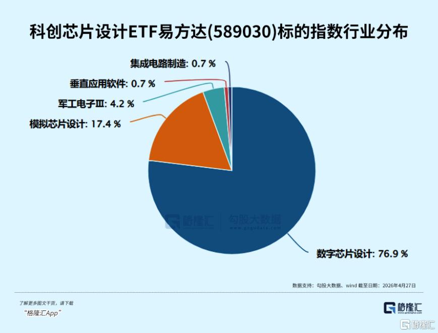 科创芯片设计ETF易方达(589030)跟踪科创芯片设计,数字芯片设计占比76.9%,模拟芯片设计占比约17.4%,与AI芯片相关度最高,寒武纪、海光信息、芯原股份等龙头占据主要权重,是市场上纯正设计主题指数。