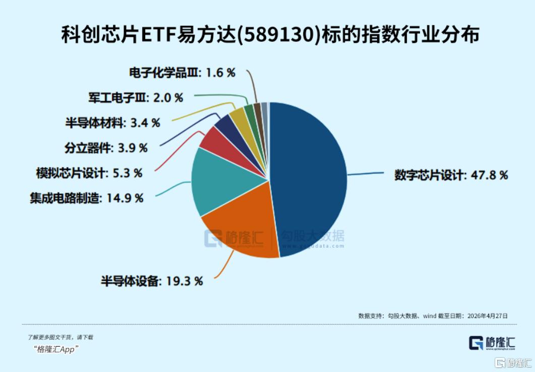 科创芯片ETF易方达(589130)跟踪科创芯片指数,聚焦科创板芯片核心资产,涵盖芯片设计、制造、设备、材料、封测全产业链,数字芯片占比47.8%,半导体设备占比19.3%。