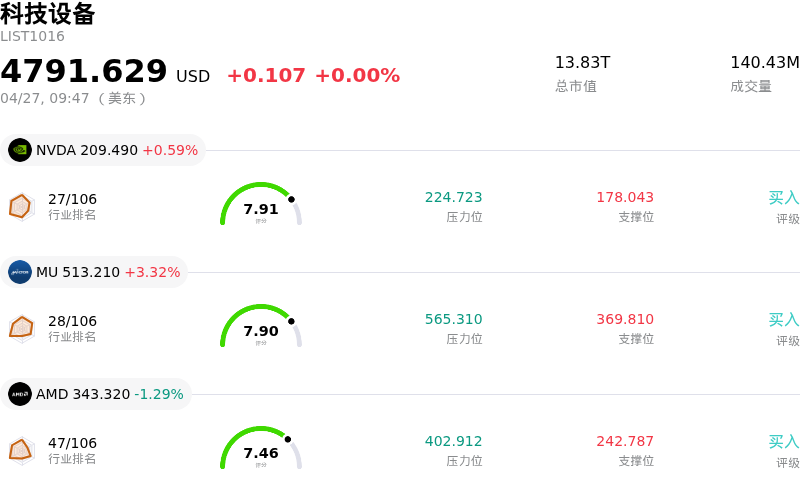 高通 (QCOM) 开盘上涨6.80%, 所属行业科技设备上涨0.00% ,公司涨幅跑赢行业涨幅,行业成交额前三股票 英伟达 (NVDA) 上涨 0.59%;美光科技 (MU) 上涨 3.32%;超威半导体 (AMD) 下跌 1.29%。