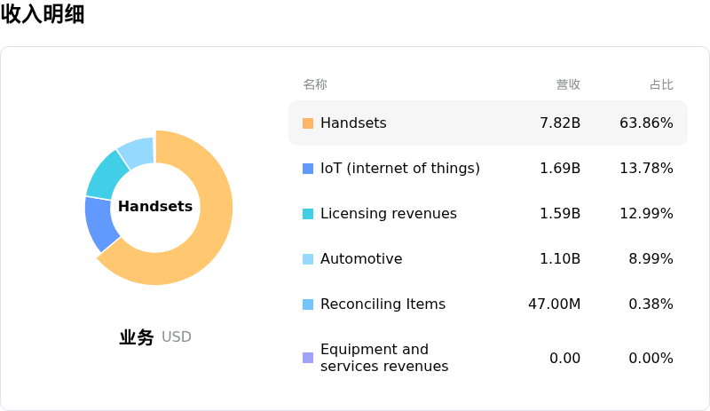 高通 (QCOM) 处于科技设备行业,最新年度营业收入$44.28B,处于行业5,净利润$5.54B,处于行业7。「公司简介」
