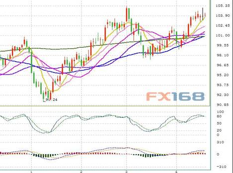 油价下行的初步支撑位于8日均线103.60,进一步支撑位于4月9日低点102.03,更关键支撑位于101.00。